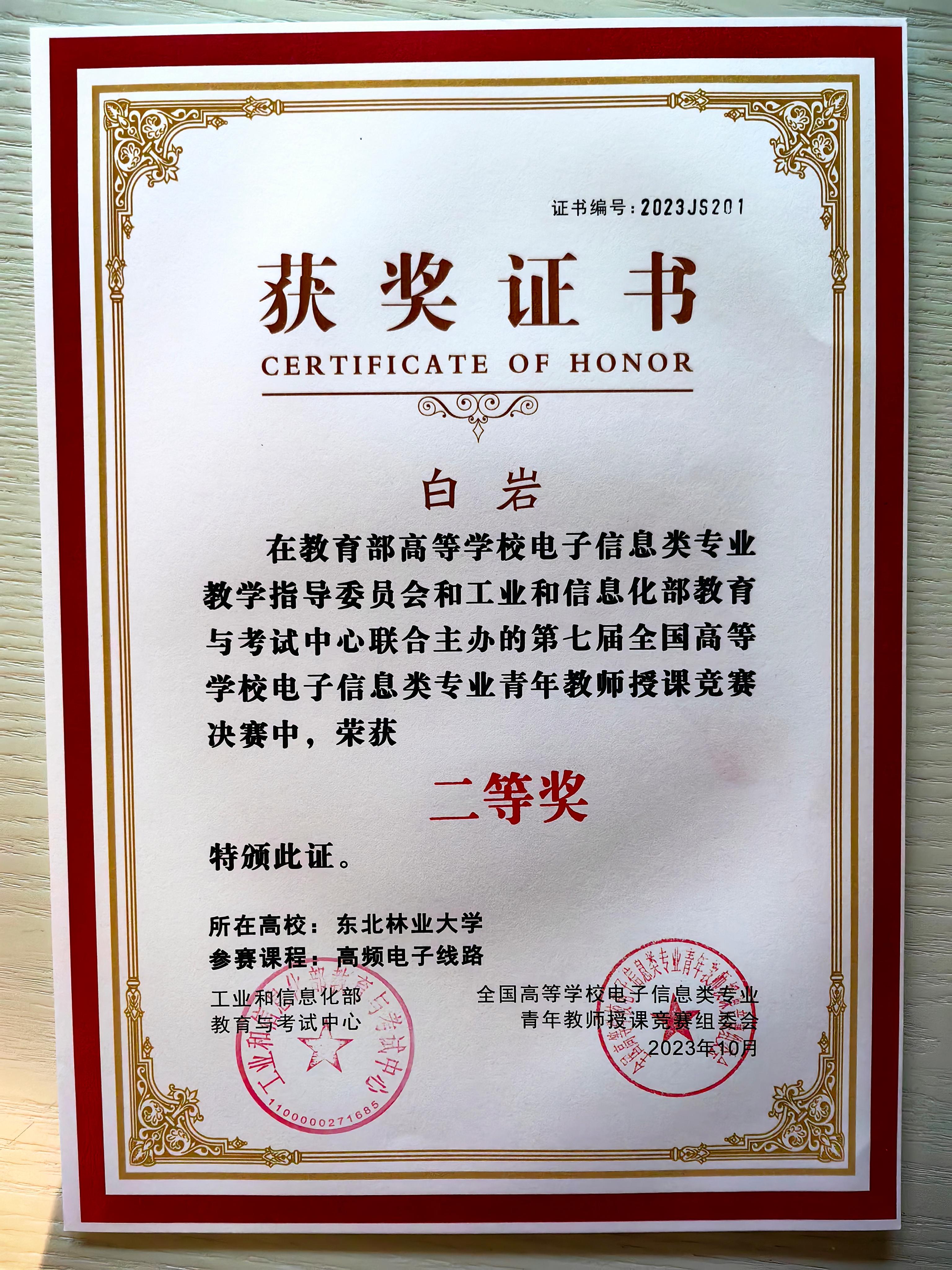 全国高等学校电子信息类专业青年教师授课竞赛由教育部高等学校电子信息类专业教学指导委员会以及工业和信息化部教育与考试中心联合举办,今年4月份启动以来,共有来自25个省、直辖市、自治区的190所高校、700余名教师报名参赛,经过分赛区评比,来自四川大学、武汉大学、哈尔滨工业大学等63所高校的107位教师进入决赛。决赛于2023年10月22日顺利结束,经过现场评比,决出一等奖21人(含特等奖1人),二等奖35人,三等奖50人。经过现场抽签、授课、微课展示等环节,我校yl9193永利官网教师白岩副教授获二等奖。近年来yl9193永利官网注重教师教学技能的培养,通过教师培训、互动研讨、个性化指导、定期评估、反馈改进等一系列举措提升教师授课能力与授课水平,全面提升教师的教育教学水平和科研能力。